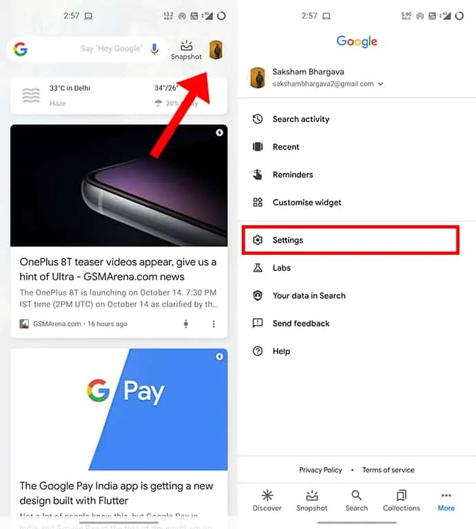 To change the same-old feature of article opening as an individual app, open app drawer and then open the Google app. Now Tap on the “Profile Picture” option in the top bar and click on the “Settings” option as shown below.