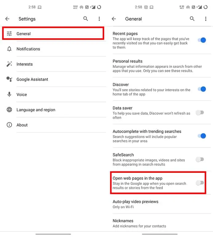 After going on to the google app “Settings” page, select “General” and turn off the “Open web pages in the app” option.