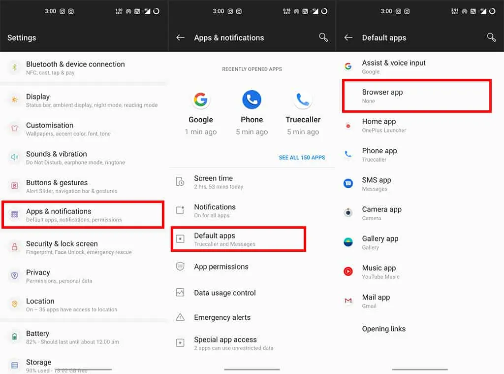 Usually, people prefer Google Chrome as their default browser. However, if you don’t, you can change the default browser by simply opening system Settings > Apps & Notifications > Default apps > Browser app.